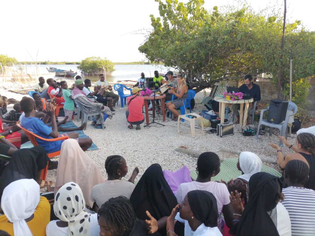 Diogane. Les braiements des ânes incessants. Les appels à la prière des trois mosquées. Les rires des enfants. Et le cri lointain de la hyène. Voilà l’ambiance sonore de nos trois semaines passées à Diogane. Nous frôlons la mangrove pour arriver à la voile, nous posons l’ancre et nous débarquons acceuilli.e.s par une nuée d’enfants. C’est parti ! Assez rapidement nous nous réunissons avec les professeurs du collège et de l’école pour décider du programme des ateliers et spectacles. Finalement nous avons proposé des ateliers de musique pour les plus petits, théâtre pour les 6ème-5ème et les CM1-CM2 ont pu assister à notre spectacle de conte musical. Avec les 4ème et les 3ème, on s’est lancé le pari de préparer des reportages et programmes radio dans le but d’animer une émission en direct dans le village à la fin de notre séjour ! Mission accomplie, c’est ce temps fort du plateau radio qui ponctuera notre présence à Diogane, moment qui a réuni les collégiens et bien d’autres personnages du village. Au programme, des reportages sur les activités de pêche, un journal d’actualités, des moments musicaux et un enfin un micro trottoir (renommé micro bolongs pour l’occasion !) avec cette question